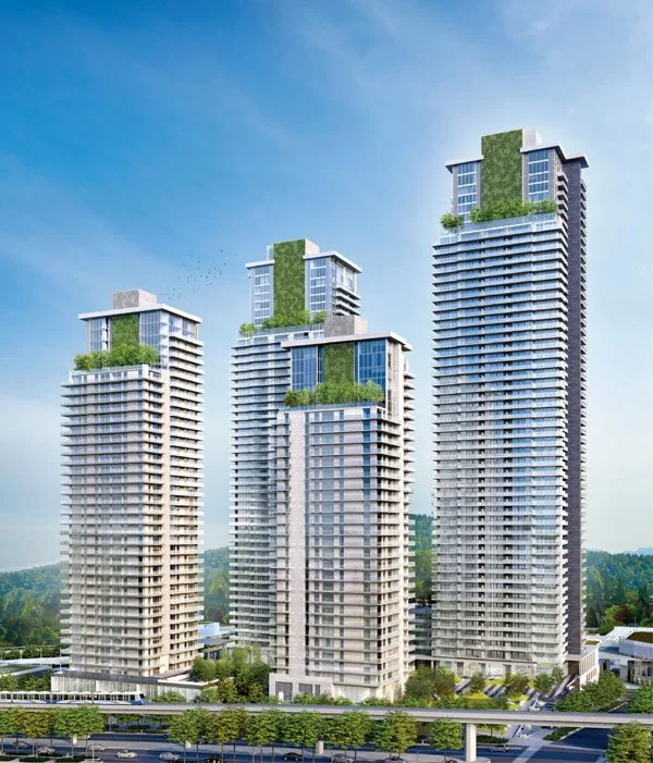 Burquitlam park consists of a 50-storey condo tower and 30-storey rental tower with 275 market rental units and 435 condo units on a 3.96-acre site near the Burquitlam metro skytrain station.